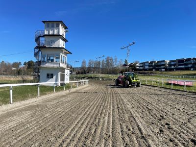 Han fortsetter til ovrevoll.no: - Vi vanner på, men sliter litt med å få nok vann på dirt’en. Sol og vind tar bort 30 prosent. Og tanken må fylles opp, 8000 liter og 24 000 liter i timen. Men det blir en jevn bane, ingen forskjell. Feste skal ikke være noe problem, men banen blir kanskje litt dypere enn vanlig. Jeg gir en liten fordel til hester med lav vekt i dag.