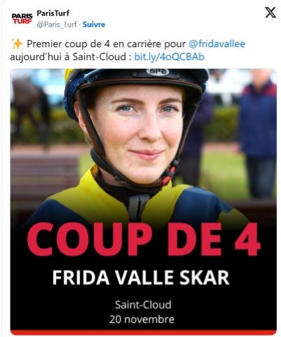 * Frida Valle Skar fyller 28 år den 5. februar. Hun vant 46 løp i Frankrike i fjor og står nå bokført med 240 førsteplasser. Tre av dem tatt på Øvrevoll i 2016 (Borzakovski, Ingvild, Tookwino). Hun var seirende rytter i 2000 Guineas (Gruppe 2) i Tyskland i fjor på hoppa Matilda som vant det klassiske løpet med 6,5 lengder. I november i fjor fikk hun pene overskrifter etter fire seire (én delt) på Saint-Cloud i Paris på én løpsdag (faksimilen fra Paris Turf på X over).