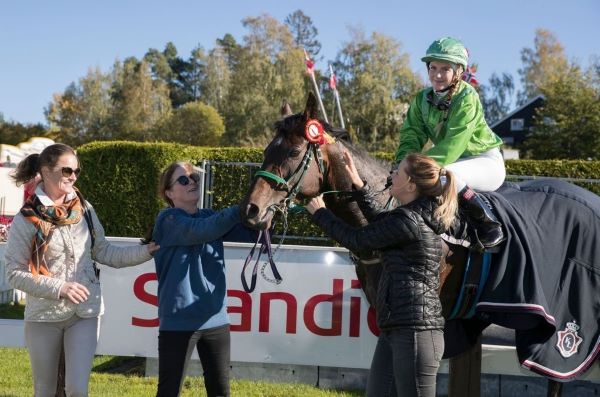 *- En hoppe som vinner. Og kvinnelig trener og kvinnelig jockey. Det ble mye oppmerksomhet. Dette har vært styrt av de franske galoppmyndighetene. Jeg har fransk lisens, men rir litt for begge land. Også rir man selvfølgelig for seg selv i denne type jockeymatcher, uttaler Frida som er norsk statsborger.