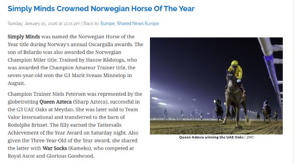 * «Simply Minds Crowned Norwegian Horse Of The Year”, skriver Thoroughbred Daily News (faksimilen over).